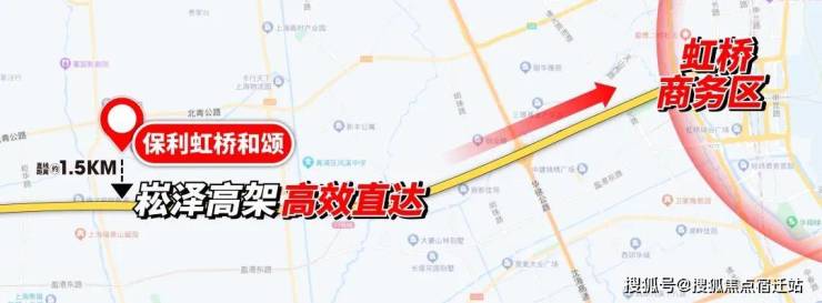 保利虹桥和颂直线距离崧泽高架仅约1.5公里,上高架后没有红绿灯直通大虹桥核心。