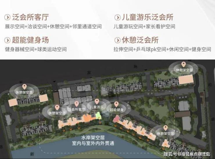 约1050m²水岸主题泛会所,通过泛会所客厅、儿童游乐泛会所、超能健身场和休憩泛会所的多空间设计,满足不同年龄段业主的休闲、健身和娱乐需求,可停可游可玩的空间表达,在有限的空间中,表达生活愉悦的无限可能,带来邻里互动的乐趣。