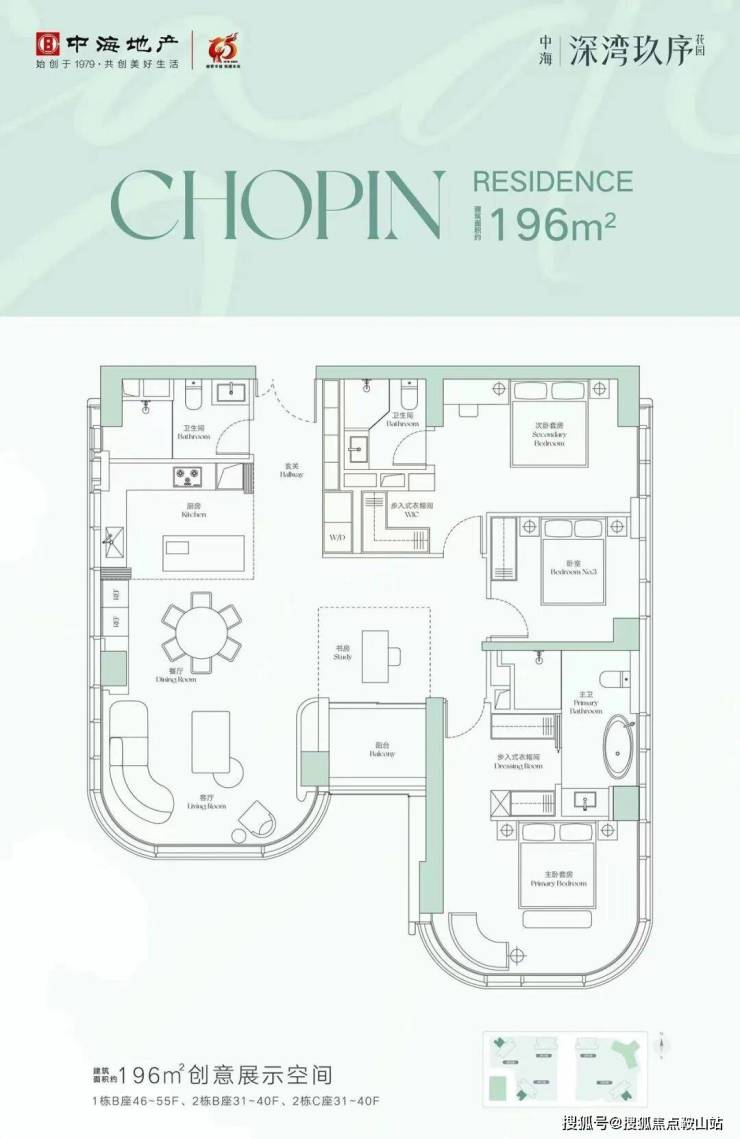 楼王户型,位于花园正中间的位置,最安静。综合实用率为78.83%,实用率最高,唯一带生活阳台的户型。专梯专户,电梯厅更大,带独立保姆间、储物间和玄关。空间尺度很足,使用功能上几乎没有缺点。中西厨餐客厅一体,朝正东或正西,多面采光。