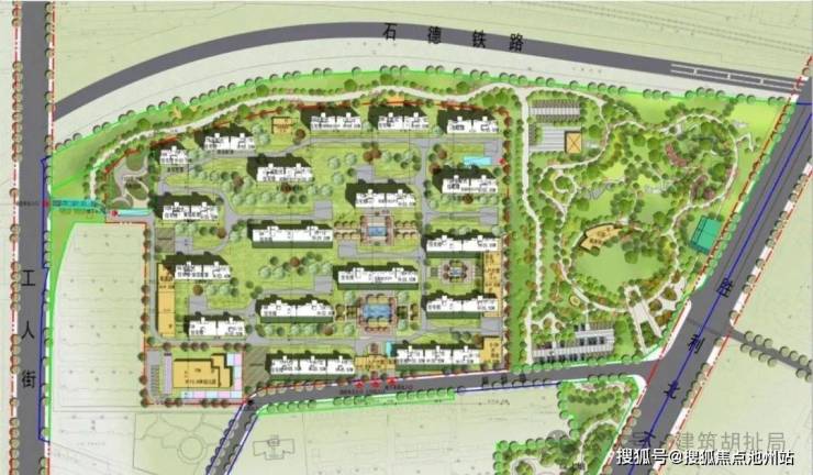 接下来咱们先上总图。先说优点,优点就是相比于隔壁,它一是用地东侧是一个70亩的城市公园,北侧也有大概25.5米的公园绿地将用地包裹,出门即公园是一点也不假。而且这个公园的代建主体也是城更集团,所以这个公园在设计上也是基于这个项目的营销出发的,包括未来售楼部也在公园里,就是说这个公园虽然是给大家用的,但是从设计出发点上,是为了这个项目的营销使用的。这是这个项目最大最大的优势,没有之一。