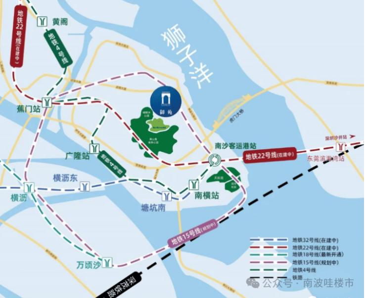 交通:地铁4号线(已通车)、地铁22号线延长线(规划中)、32号线(规划中)、明珠湾大桥、虎门大桥、南沙客运港、邮轮母港、莞佛高速等水陆多维度交通在此吹响了“集结号”,形成5维立体交通路网