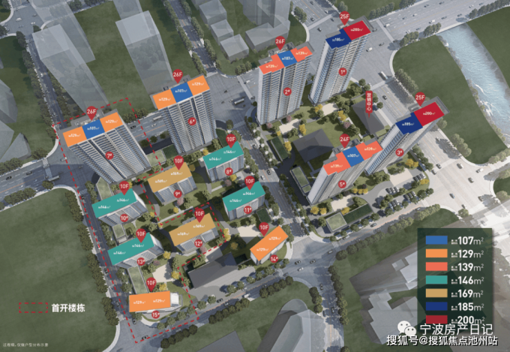 整盘建面约107-200平,为低密公园洋房+看江大平层。洋房为一梯两户,高层为两梯三户设计。185平和200平大面积均在大东江一侧。西区低密洋房,东区看江大平层;超大间距,错落排布、无一对角。