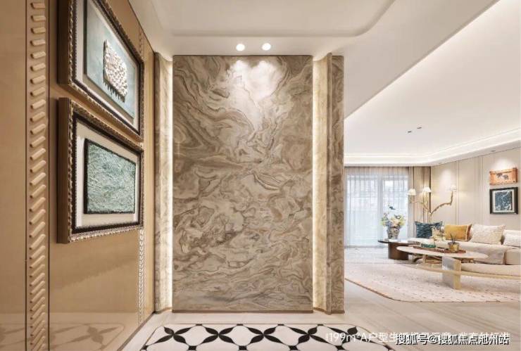 进门第一眼,就能看见一整面的白色石材,它有个很好听的名字,叫做安第斯雪景,颜色温润典雅,纹路自然向上,也寓意品质生活蒸蒸日上。