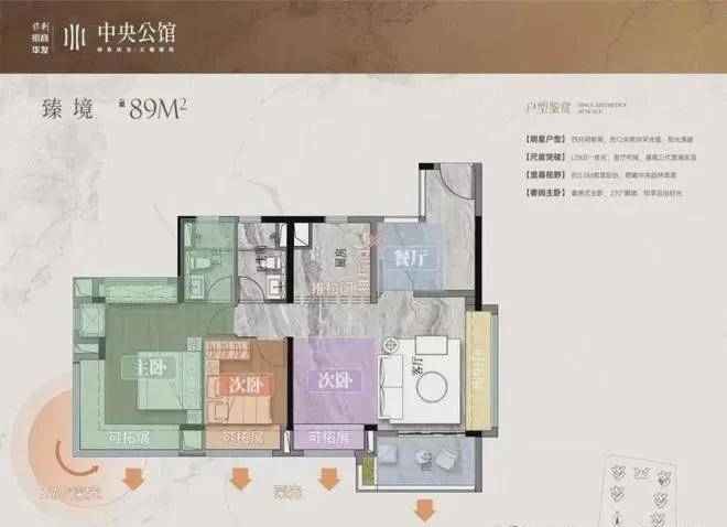 建面89平三房,分为A、B两个户型,南北对流设计,四开间朝南,公区没有承重墙,可以打通做大方厅,小何觉得这个是比较灵性的。