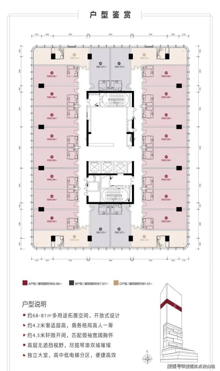 面积:68-85平米 (30-35层酒店式办公)