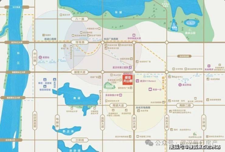 我们一起来看看维佳关山郡的位置到底有多好!项目位于关山大道与雄楚大道的交汇处,就在光谷K11正对面,南侧有保利时代广场。维佳关山郡落位图