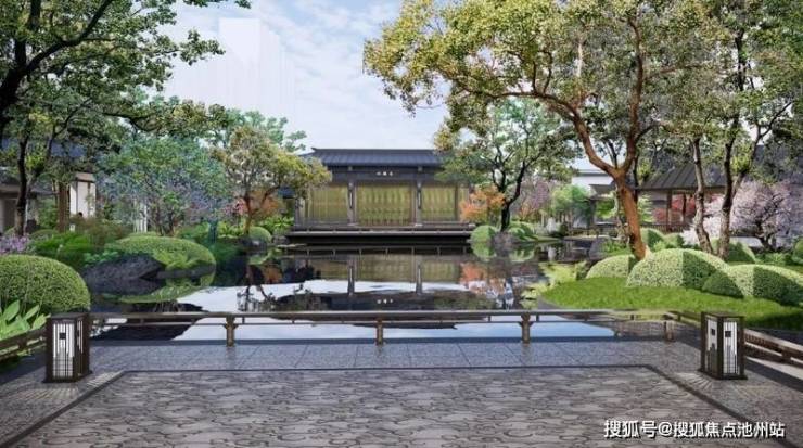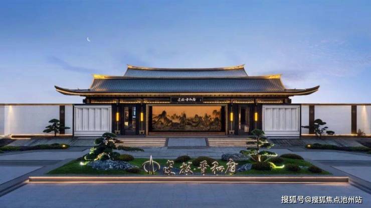 真正的东方人居,从不拘泥于传统符号复刻,而是以文化为骨、地域为魂,重构当代建筑语境。晋和府跳出挑檐、大屋顶等同质化中式套路,以东方根基为底,融吴地风雅之温润,运用中轴对称手法,塑造出高约7米、长约43米的九脊歇山顶巍峨大门,搭配两侧对称景墙与仪式水景,尽显登门望府的大家风范。