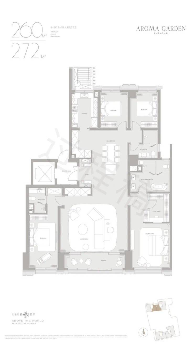 户型规划主力面积在260-882㎡区间。豪华主卧套房设计(部分户型为全套房设计),逾百平方客餐厅一体 + 270度转角落地窗 + 超宽尺度花园阳台,臻选智能化家居系统及世界顶级精装品牌,赋予居家艺术与智慧生活全新表达。