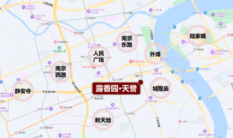 作为上海的绝对市心,露香园直线距离人民广场、淮海路、外滩、豫园等上海市地标性区域均不超过1.5公里,距离陆家嘴直线约2公里。