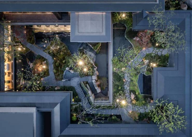 通过下沉会所庭 院,将传统平面绿化转化为垂直的多层次园林空间, 打造出了当代立体山体水景观 ,身处其中在步履起承转合间,串联起一幕幕诗画风景。
