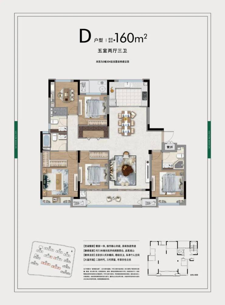 在户型设计上,房总东茂府既追求张弛有度的生活空间,又兼顾功能的实用性。以建筑面积约160㎡的户型为例:它当然可以轻松实现舒适的宽厅四房格局;但与此同时,也可以像装修建议图这样,打造出五个功能完备的房间来,实现向上越级的生活体验。