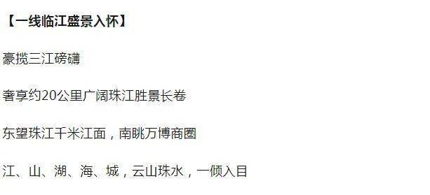 项目最大亮点是拥有约3.5公里的一线江岸线,社区内打造了多个观景平台和亲水平台,业主可尽情享受珠江美景和滨水生活体验。