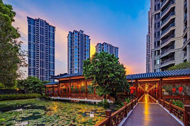 社区园林由亚洲顶尖园林设计团队打造,以"东方秘境花园"为概念,引入全冠移植的名贵树种,打造多层次立体园林景观,形成"园中有园、景中有景"的视觉效果,营造出极具仪式感的归家动线。