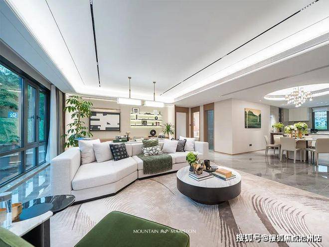 在这个过程中,绿城将理念、资源、审美多重融合。因此在理念上我们可以看到,绿城的“让山居成为一场艺术”,将山景与建筑共生的理念注入每一寸空间;资源上:项目择址的梅一北岸是片区难得的福祉,1.5km生活圈内涵盖了1个山体公园+1大CBD+3个地铁站+6所品牌学校+8大集中商业,山、园、湖、城万物皆合于此;审美上:经典的绿城Super Flat超平立面,大面积落地玻璃,嵌入横向斜切的金属线条,270°山景转角窗打破室内外边界……