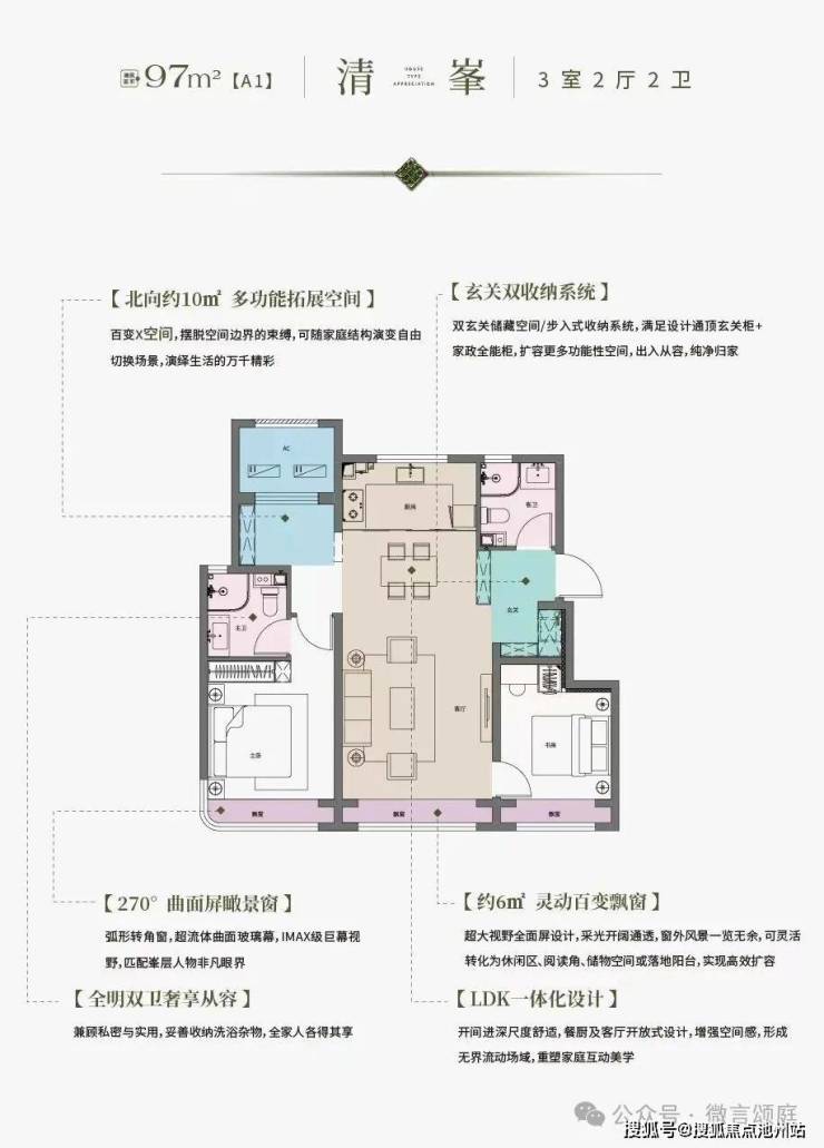 据说项目首开97平米洋房卖的非常好。建筑面积97.48,套内面积78,北向次卧有5平米的赠送,最牛的是三个飘窗共6平米都可以砸掉。全部使用面积加一起能达到89.4平米,让这个户型的实际出房率达到了92%,对外主打的主卧弧形窗却没给我多大惊艳感。
