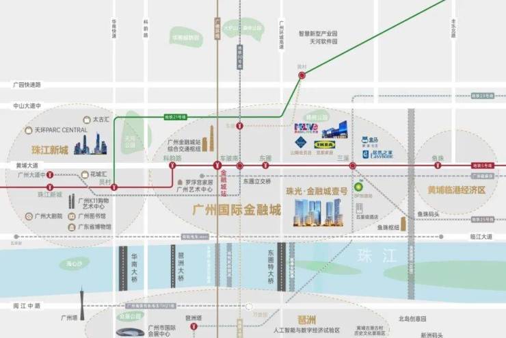 交通配套:珠光·金融城壹号紧邻黄埔大道,距5号线三溪站仅约200米,未来区域内还将增加5条地铁线、广佛环线城轨以及多条过江通道。