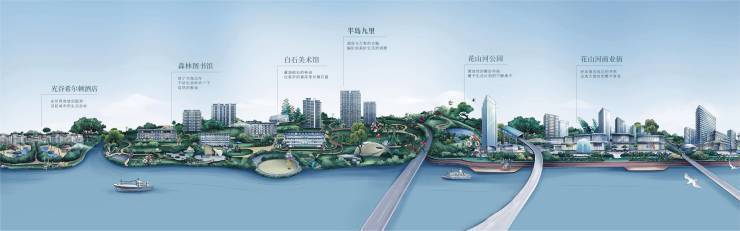 立体路网:经由城市主干道花山大道直通光谷中心城,花城大道畅联全程,通过植物园隧道直连武昌繁华区