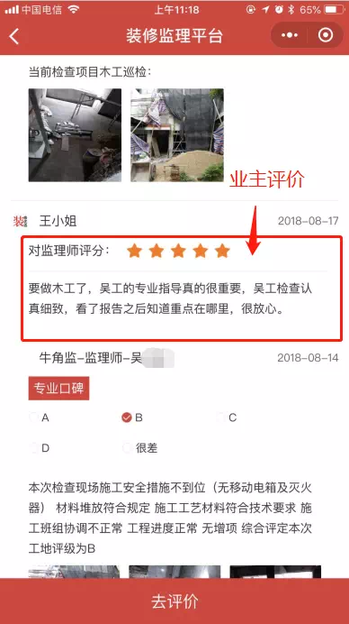 在微信小程序“装修监理服务平台”记录了装修业主们的实时施工情况,每个工地都能看到监理老师的专业检查报告,几乎每个工地能得到业主的好评!