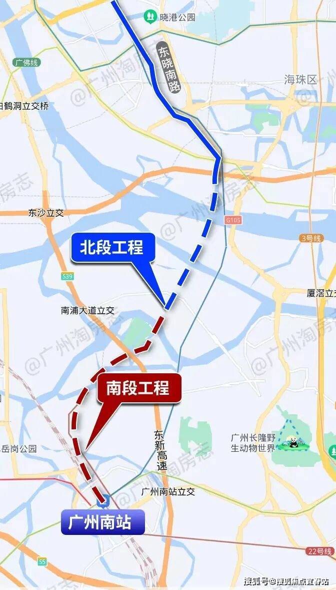 东晓南放射线,东晓南路至广州南站连接线全长约9.5公里,路线整体呈南北走向,由南段工程和北段工程组成,意义在于加强广州主城区与广州南站的直接联系;采用城市快速路标准,双向六车道,设计速度为80公里/时。
