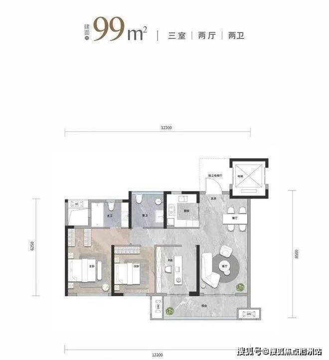 建面约99平户型,打破常规,空间布局设计优化到了极致,赋予其独立电梯厅、通透三房、双卫设计的高配置
