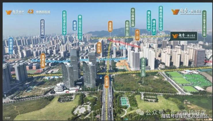◎便捷交通:享金星路+长望路黄金十字路网,将串联高铁西交通中心、麓谷智造中心、市府政务中心、滨江金融中心、梅溪湖等长沙政务经济核芯区域南北东西畅通无阻。(数据来源高德地图直线测距)