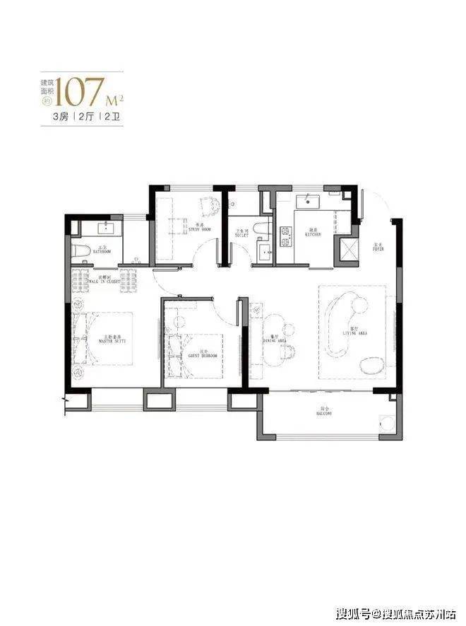107㎡是103㎡户型的PLUS版,厅面宽达到5.5米。汲取了103㎡户型所有的优点;如餐客厅一体,U型厨房,动静分离设计,大尺度主卧套间,以及每个卧室都赠送大面积飘窗。