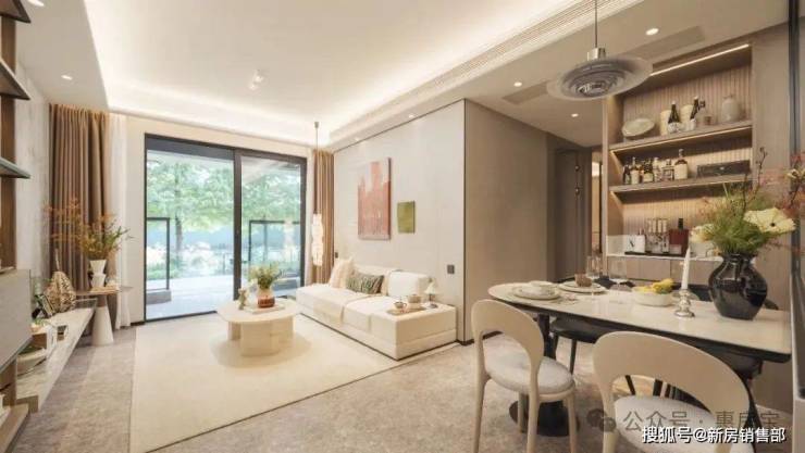 有效的将河岸原生水杉等自然美景融入,被自然包裹的阳台以精致现代的花砖铺设,搭配吧台,卡座,打造出繁入静的城市滨水一角。