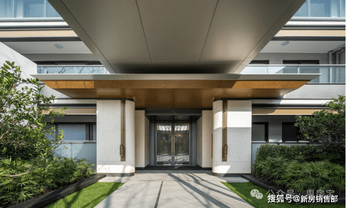而入口的仪式庭院作为整个社区的第一视角界面,开发商以对称精致的logo高墙形成夹道的礼仪大门,将繁华喧嚣的城市界面与私享的归家区域划分开来。