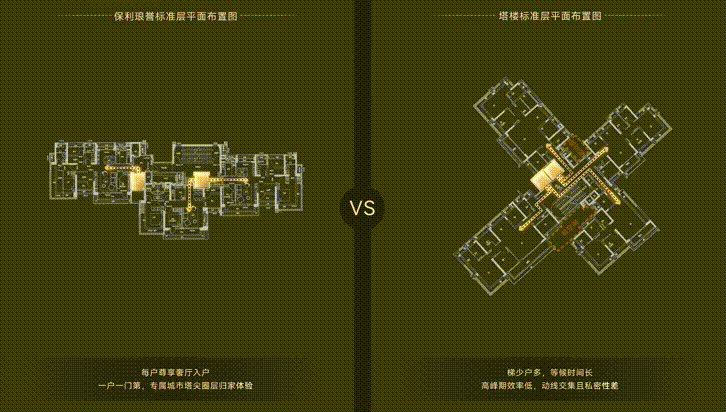 保利琅誉,户户坐北朝南,实现真正意义上的南北对流,确保室内环境空气清新。而塔楼多户环绕,房间进深较深,通风不流畅,空气流线较差,难以确保房间内及时有效换气。