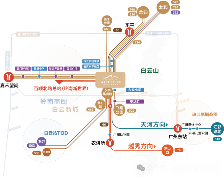 (2)白云东平接驳枢纽:14号线/规划中18号线北延段,经京溪路、广州东站、2站快速直达珠江新城;