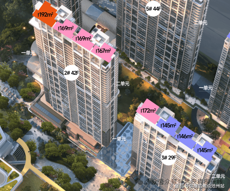 2号楼共42层,3号楼共29层,均为2个单元,2梯2户设计,包含建面约145平-192平房源。