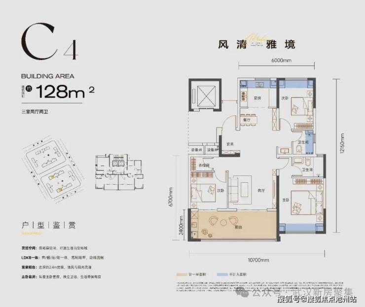 ①122%实际得房率:通过约56平三大露台、2.4米宽大阳台、客厅挑空、飘窗等方式整体赠送面积达到108㎡,得房率122%。