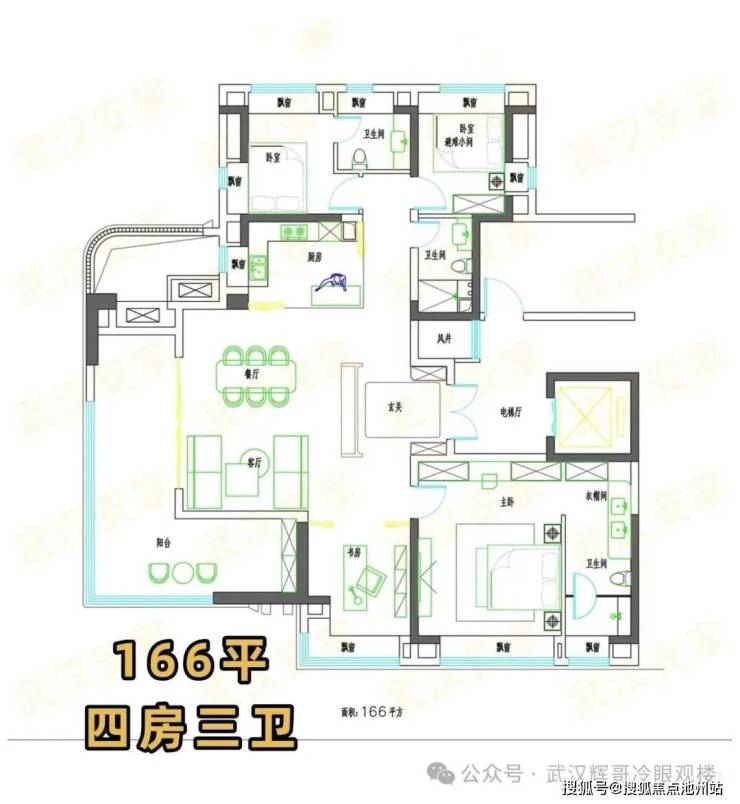 166平,270度转角落地窗客厅,一梯一户独立电梯间,四房两厅三卫,有2个套房。