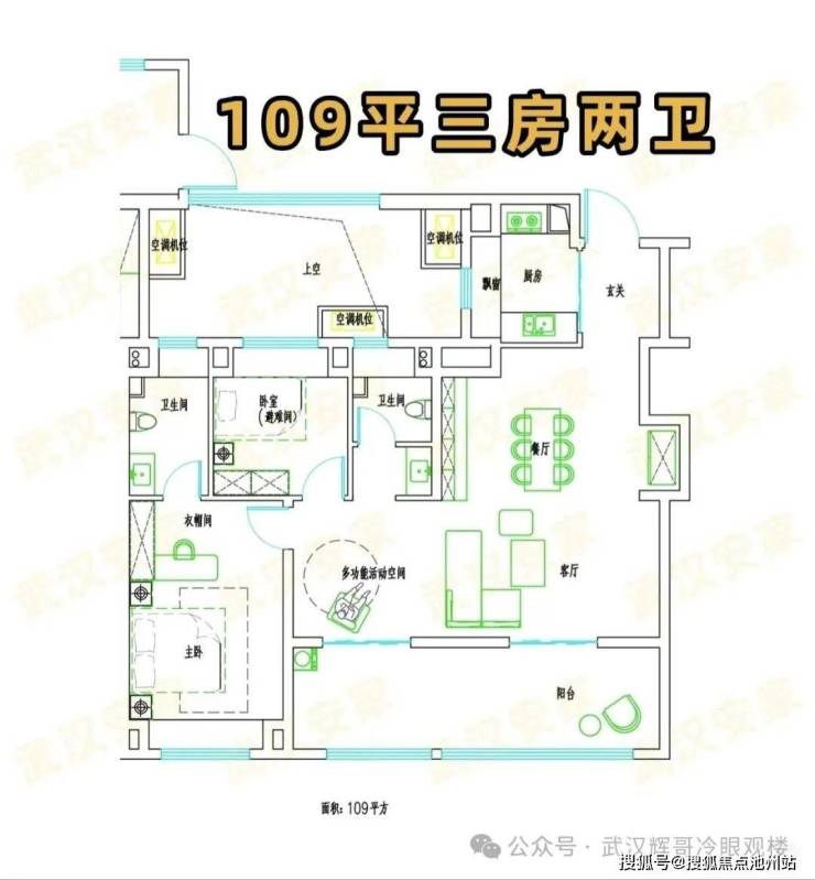 109平的户型,其中厨房处赠送的飘窗让厨房更大,阳台进深大超多赠送面积,飘窗都能优化,但好像没有做成独立电梯间的设计。