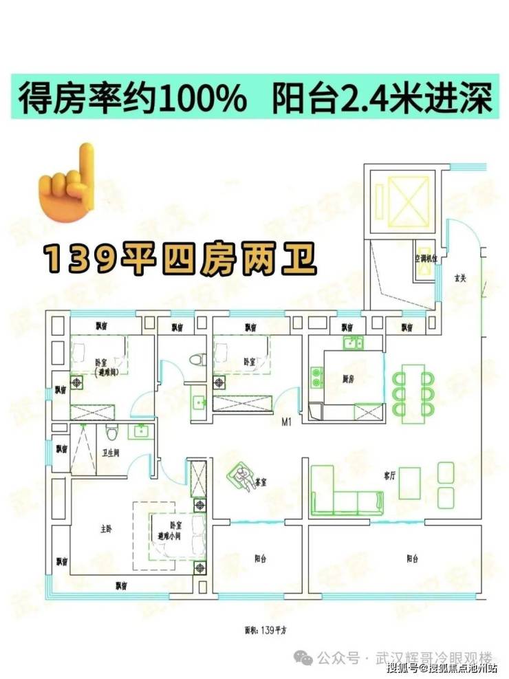139平四房两厅两卫设计,大横厅,是一梯一户独立电梯间。