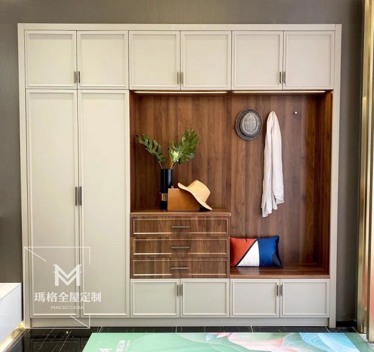 极简风的门型+流畅的几何线条+高级色系,各种元素的相互融合,打造出一个现代简约、舒适雅致的玄关。而抽屉和门板的优质结合,带来更实用的收纳性,玄关自然更“有颜有品”。