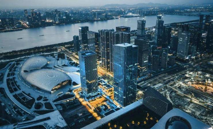面江是钱江新城和奥体组成的「城市会客厅」,近江是杭州之门、大小莲花碗、大墨镜组成「城市地标群」,七甲河延绵而过,“拱卫”着