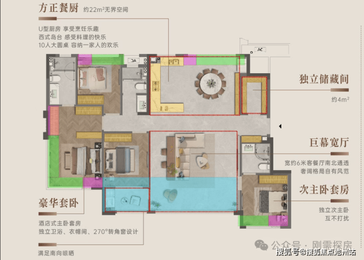 127平:4房2厅2卫,占比22.6%,116平的升级版,客餐厅面宽加大,主卧出现了目前改善常见的L型窗,进一步拉高了得房率。