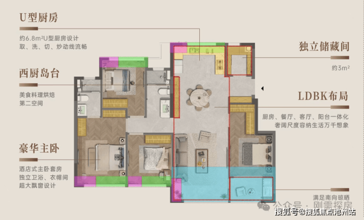 116平:4房2厅2卫,占比38.4%,占比最高的户型,非常主流的布局,四开间朝南,特色在于多搭配了一个储藏间,劣势在于入户对着餐厅,存在动线影响,此外客厅尺寸略显一般。