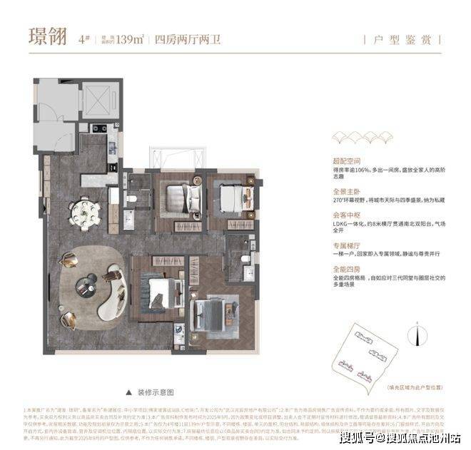 该户型为2、4号楼端头边户,南北通透,三开间朝南,结构相对常规。带独立电梯前室,且电梯前室还做了一道门进行隔离。建面约139平可以做四房,功能性比较强。亮点是主卧全景舱两面拐角飘窗,优化面积多,采光比较好,不过床就不太好摆了,得对着主卧门口。