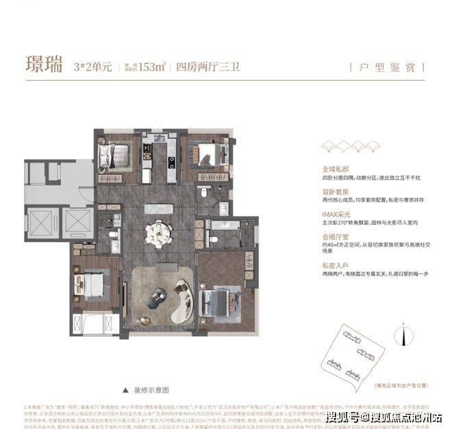 该户型带独立电梯前室,两个卧室能做到270° 景观视野,大概率也是双面飘窗。不过,南向次卧卫生间是暗房,南向次卧外有空调机位,按照户型图显示会一定程度遮挡采光(实际情况待定),餐厅位于户型中部,采光较弱。
