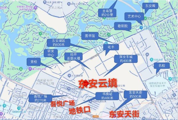 5500亩东安湖生态公园、约1910亩驿马河公园、约32平方公里锦绣天府、全国最大城市森林公园龙泉山森林公园、东安阁酒店、木棉花酒店、图书馆、大剧院、新闻中心等配套环伺;项目占据东安湖中央活力区CAZ核芯位置,项目一线瞰湖高阶产品,引领区域高端商业和楼宇总部发展