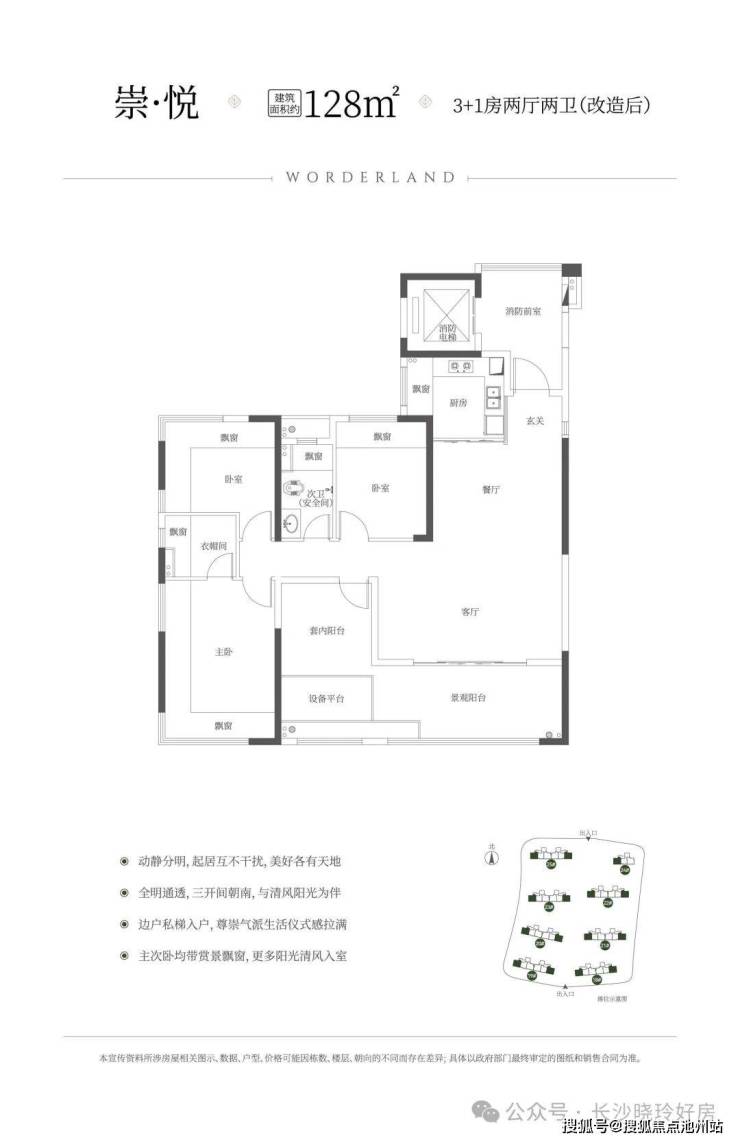 建筑面积约128㎡3+1房、约5.9m客厅开间、得房率约113%(含电梯厅)