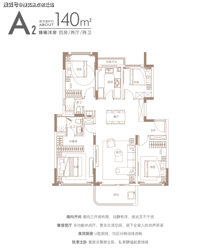 建面约140㎡四房:三开间朝南户型,南北通透,采光条件优质,客厅明亮宽敞,彰显大气布局。