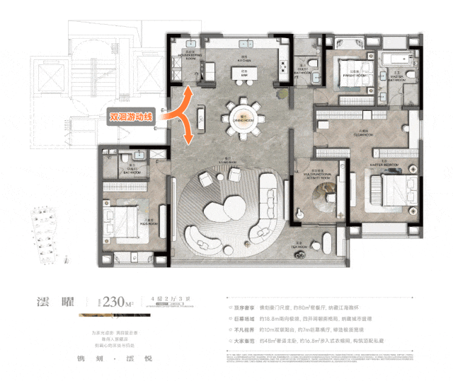 建面约230㎡户型位于23#楼王位置,户型一大亮点就是双洄游动线,一面融入社交属性的客厅、一面连接家政间、厨房。约80㎡的客餐厅超级开阔,在这里开派对都绰绰有余。约18.8m南向四开间,阳光可以毫无阻碍地照进每一个房间。还有约48㎡的奢适主卧,约16.8㎡的独立衣帽间,衣服再多也能轻松收纳。