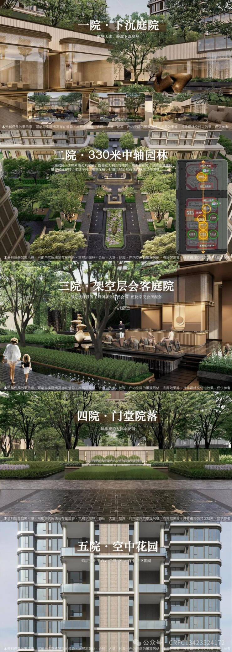 五院:下沉庭院、中轴园林、架空层泛会所、门堂院落、空中花园