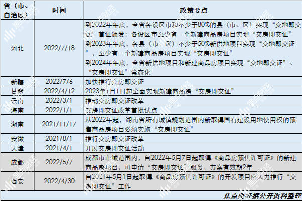 5月,成都印发《成都市推行新建商品房“交房即交证”改革试点工作实施方案》,明确成都市市域范围内,自《方案》实施之日起取得《商品房预售许可证》的新建商品房项目,可申请“交房即交证”服务,有效期两年。