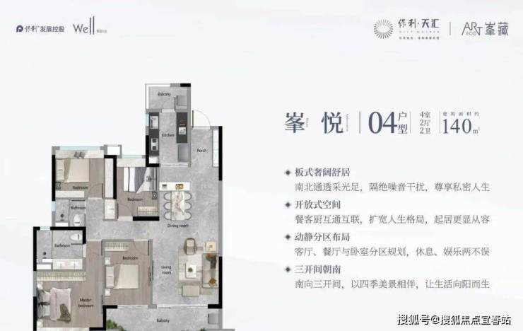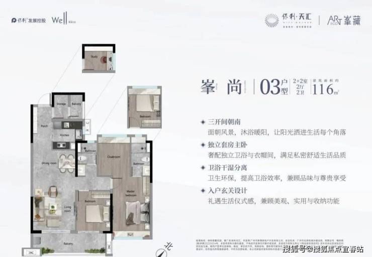 建面116平四房,三开间朝南,有南向,东向两个朝向,竖厅设计,独立玄关,干湿分离卫浴空间,2+2四房,约6米的景观阳台,主卧面积约18平,配置大飘窗,独立卫浴。