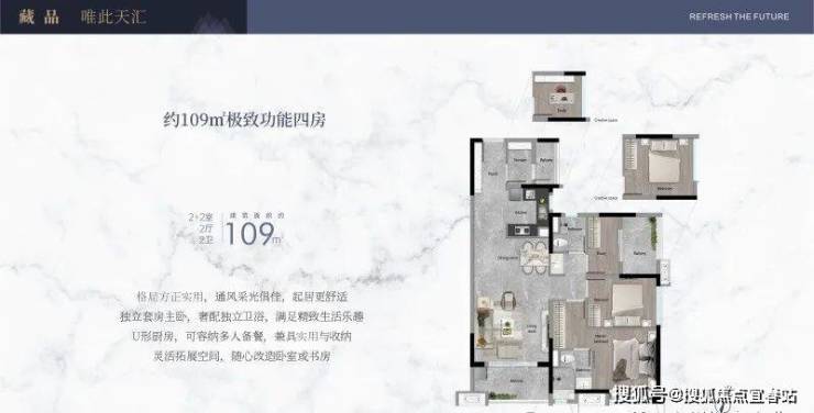 建面109平四房,户型方正,比较中规中矩,U型厨房,可容纳多人备餐,还带独立主套。
