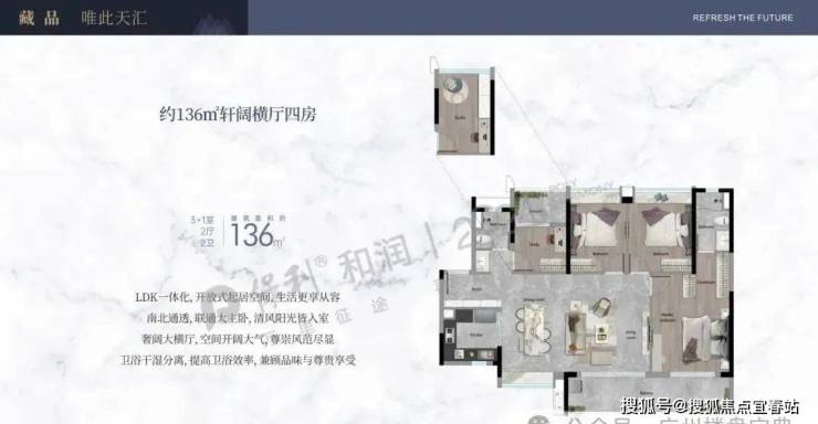 建面136平四房,LDK一体化,南北通透,大横厅设计整体开间非常开阔。